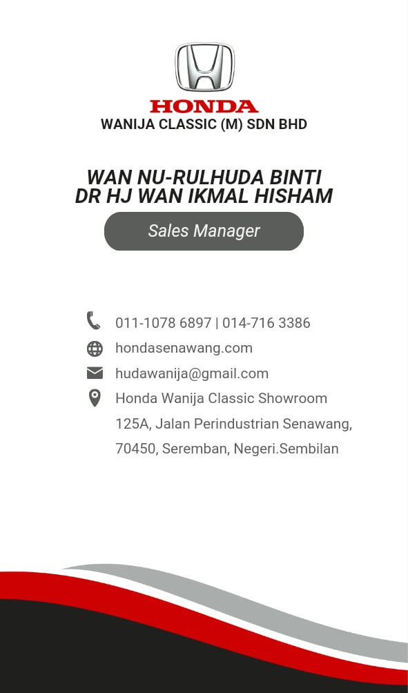 Hubungi saya sekarang untuk sebarang pertanyaan berkaitan promosi terbaru Honda. Saya akan bantu uruskan order anda dengan Pantas & Profesional.